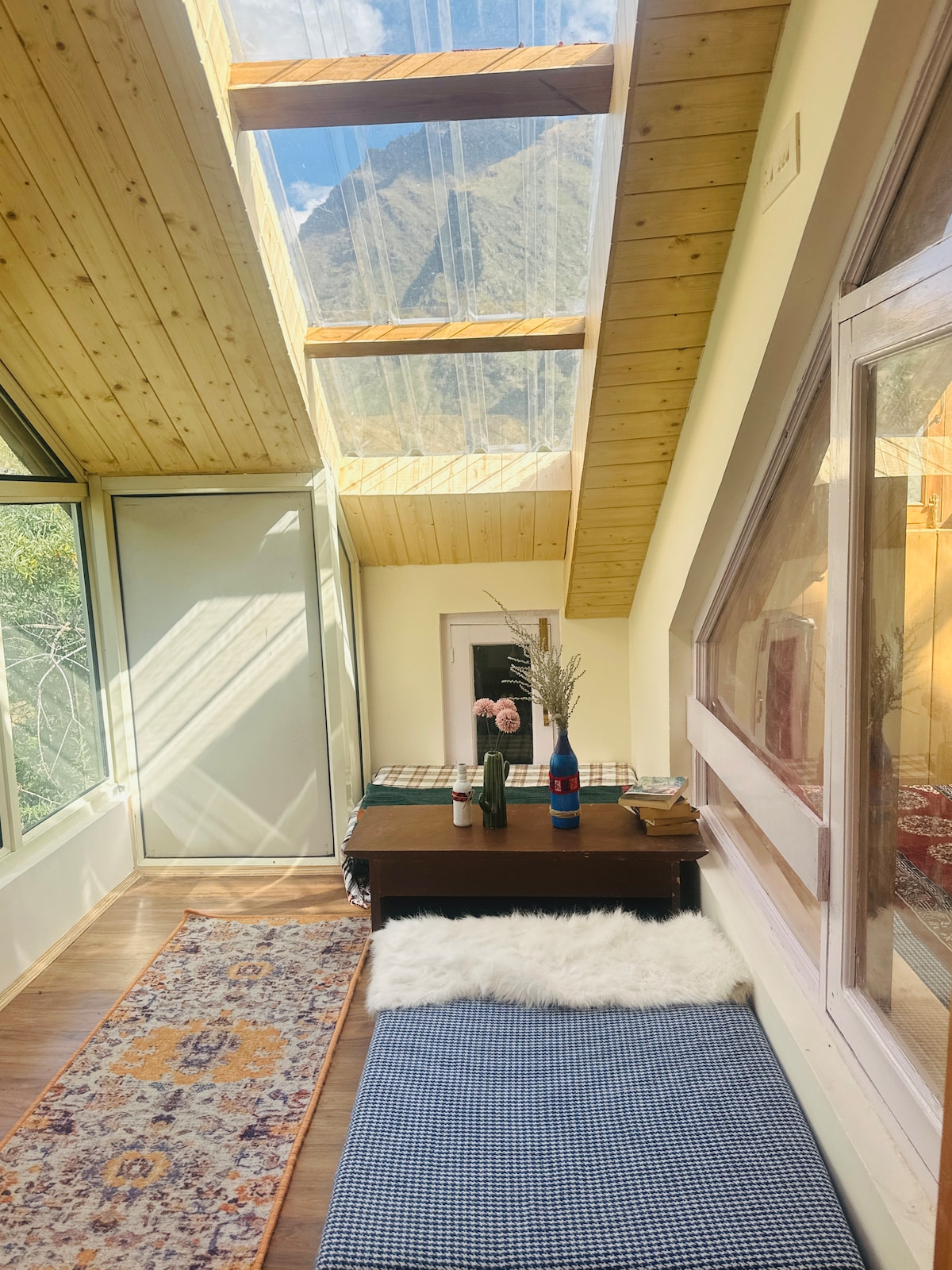Our rustic, basic but cozy and comfortable Wabi Sabi home nestled in the serene, offbeat village of Lahaul valley. Crafted with local stones,recycled wood, mud and glass. This unique abode offers breathtaking unobstructed views of the great Himalayas from the bedroom to the balcony. Just a 10 minute walk away you can enjoy forest, river and a water fall. At night relax by the warmth of the tandoor and gaze at the stars from the balcony. The peace of this place will help you to reconnect yourself