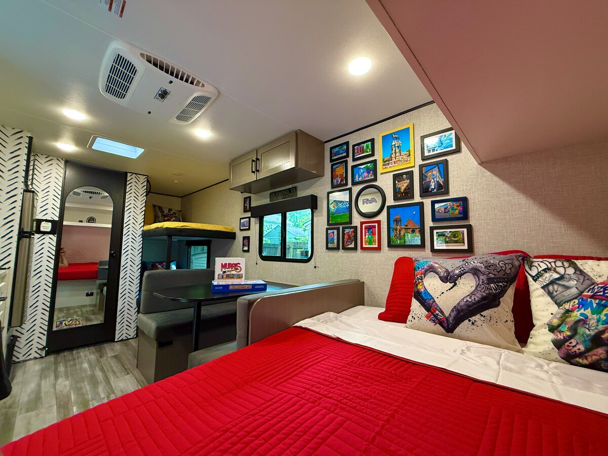 Just outside the buzz of D.C., a hideaway offers a peaceful, romantic retreat in the heart of Lanham. Surrounded by the natural beauty of Prince George's County, this cozy RV features a large full+full sofa bed, a full bed, soft lighting, and windows for golden sunset views. Enjoy intimate meals in the charming kitchenette, then unwind in your outdoor space. Whether you're stargazing or exploring nearby Lake Artemisia, this is the perfect spot to relax and make lasting memories.