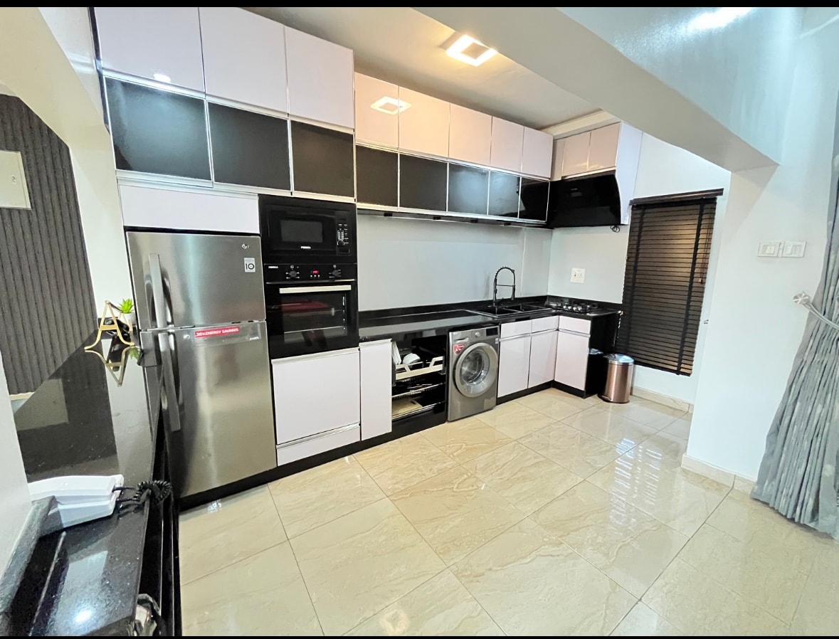 All Day uninterrupted power supply fully serviced round the clock house keeping fitted and functional kitchen smart tv free WiFi free and secure parking armed security guard government reserved area only 2 mins from all amenities including shopping cinema bar and lounges.