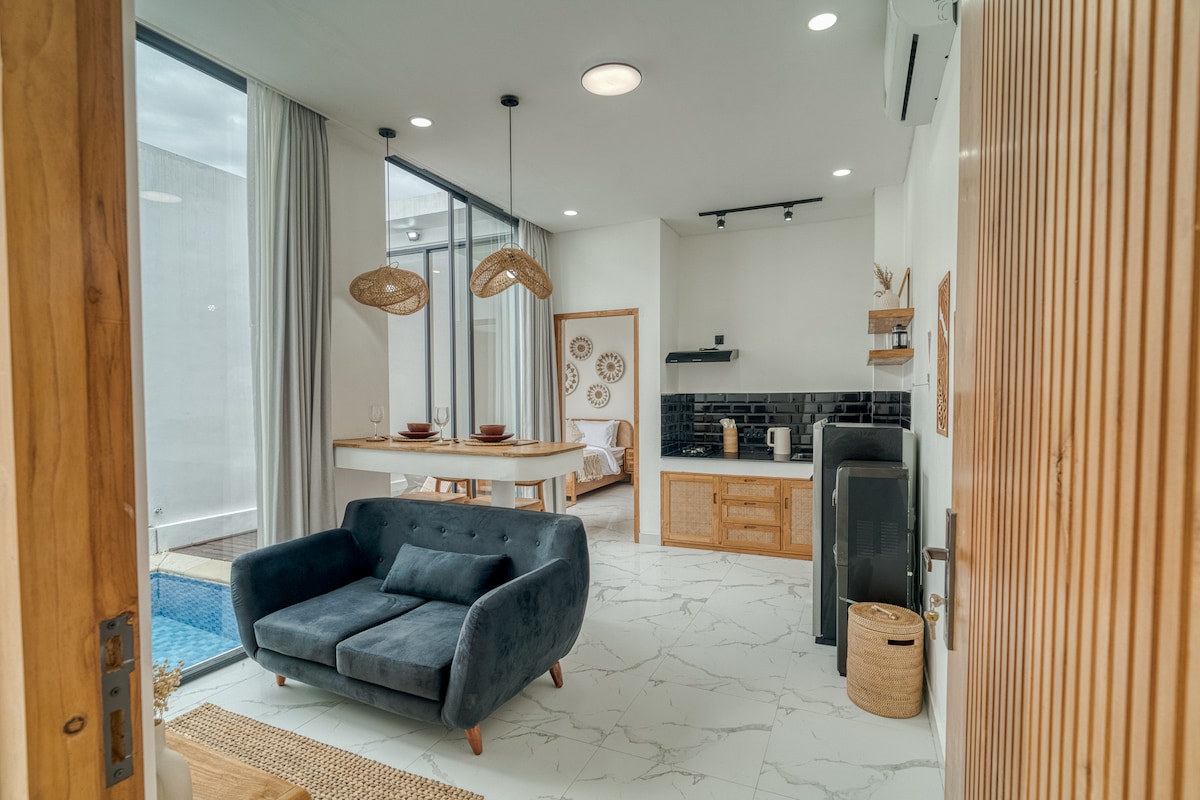 Escape to our Brand New 1 BR villa with private pool in superb location in the heart of Canggu, This is the perfect villa for couples or solo travelers who loves to explore famous spot in Canggu. Just 3-5 walk to great Restaurant, Shop, Gym, CoWorking, Pilates, cafes & Bars. It is just few minutes from famous beaches like Nelayan, Batu Bolong, Canggu Beach, This villa features a luxurious king bed, ensuite bathroom, kitchen, pool, living room, and open living spaces to relax by the private pool