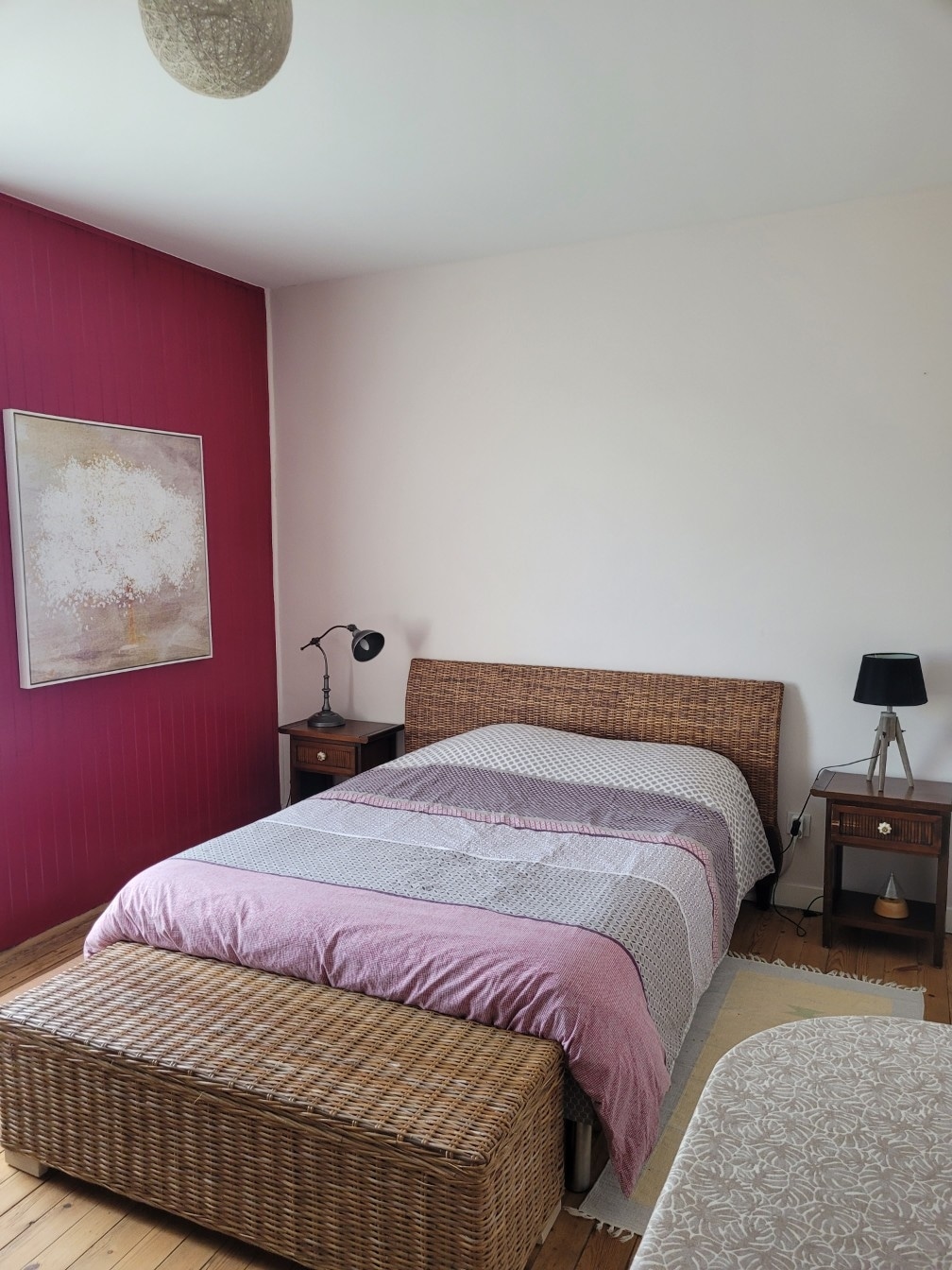 Furnished house/apartment of 85m² in the heart of the village of Derval (shops and restaurant on foot) and 40 min from Nantes and Rennes. Entrance to the accommodation on the ground floor. 1st floor: Furnished and equipped kitchen (fridge, induction stove, oven, microwave) open to living room/living room with TV. 1 bedroom with a double bed (140 x 200) and new bedding. Bathroom and separate toilet. 2nd floor: 3 bedrooms with a double bed (140 x 200) and new bedding, bathroom with toilet. Access to a fenced garden 120m².