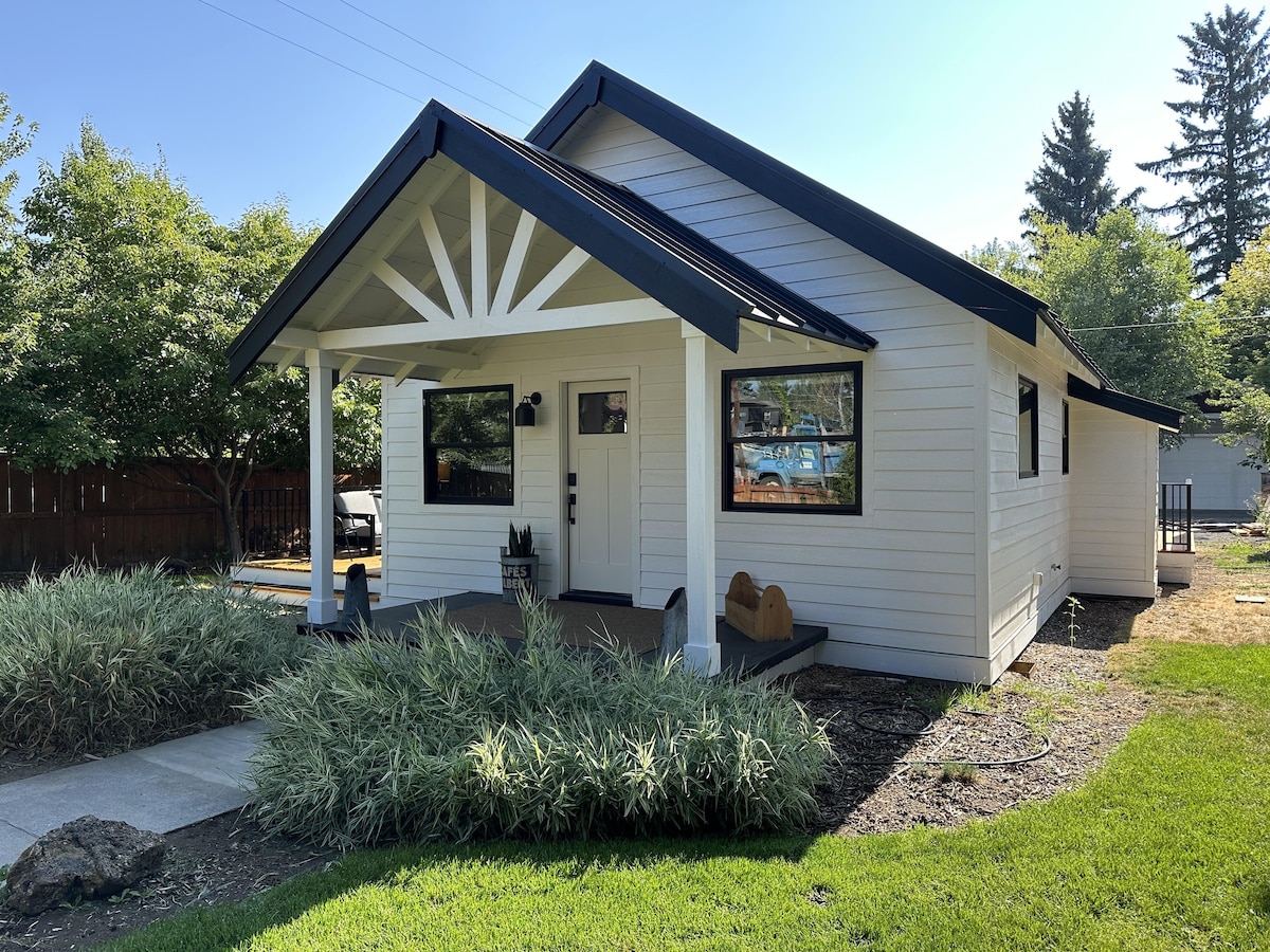 Light and bright downtown Bend vacation cottage with a landscaped, fenced yard and HOT TUB. Walk to breweries, restaurants, coffee shops , art galleries and the Deschutes river and river trail. One-bedroom, one-bath unit features a separate memory foam queen hide-a-bed in the living room. Private laundry room. Private parking spaces in back. Open floor plan with vaulted ceilings and automated skylight shades. Complete remodel. Pet-friendly (must add pet to the reservation).