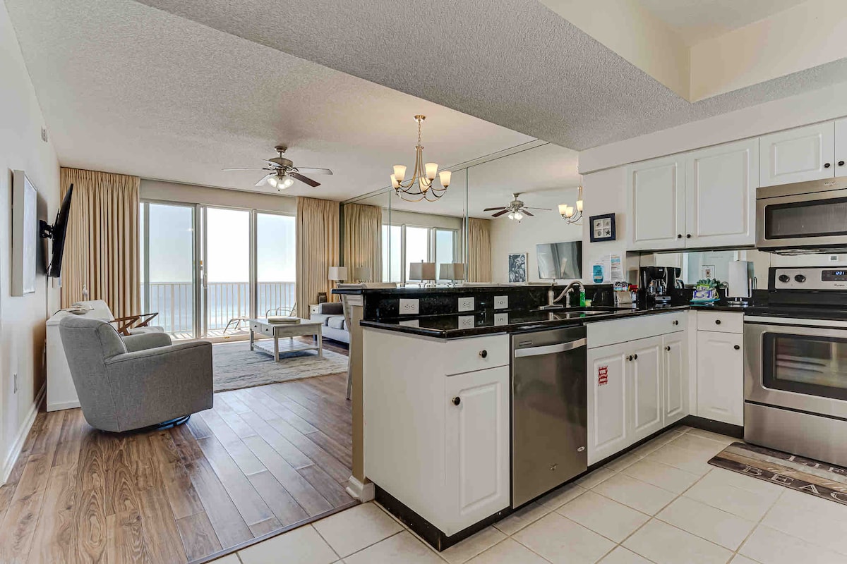 Newly updated 1 bedroom/ 2 bath condo with built in bunkbeds. Located beach side on the 19th floor with breathtaking panoramic views of the emerald waters and pristine white sand beaches The Gulf of Mexico. Fully stocked kitchen with new granite countertops and slate appliances. Reliable fast high speed internet throughout. Resort amenities include a large pool and hot tub, a beachside tiki bar serving frozen drinks and beer. A fabulous cafe that serves hot breakfast, pizza, sandwiches & salads.
