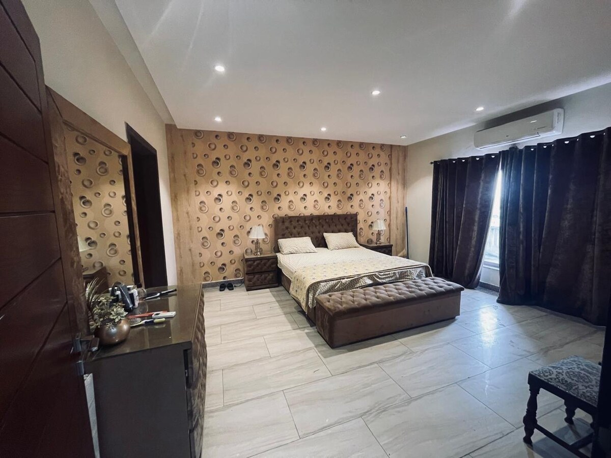 Large Farm House built on 5 kanals (2500 sqm) Left side of a duplex farm house available for 10 – 15 people. The house is located in a peaceful and green area of Islamabad Gulberg Greens. Brand new house with contemporary design, modern furniture and interior designing. Nearby: • 2 minutes: Walking/Jogging area • 3 minutes: Gym, Café/Restaurants, ATM, Mosque, Pharmacy, Supermarket • 5 minutes: Metro Bus Features: • 2 lounges and a kids lounge. • Extra cooking kitchen and a laundry room.