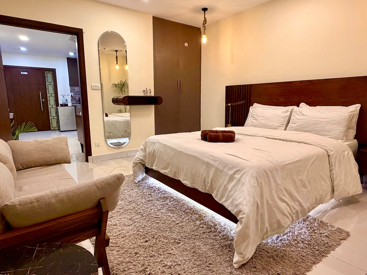 Welcome to Skyluxe 2.0! Indulge in this stylish 1-bedroom apartment featuring custom furnishings, ambient lighting, and a private balcony with city views. Located on the main expressway, near DHA, Bahria Town, top shopping, and dining spots. Enjoy access to a rooftop club with a pool, gym, sauna, and restaurant (extra charge), plus a nearby park with jogging tracks and play areas. Perfect for a relaxing stay or a quick getaway. Book now for a chic and memorable experience!