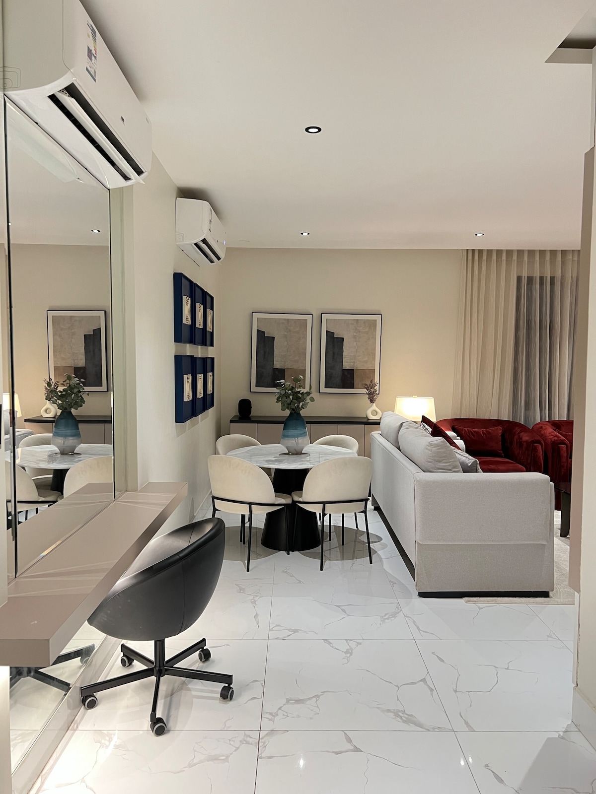 Welcome to our stylish studio apartment in Khobar. This modern space is perfect for solo travelers or couples seeking comfort and entertainment. The studio features a comfortable bed and sofa, a well-equipped coffee corner, a cabinet. Enjoy your favorite shows on the 60" Smart TV. Whether you're catching up on your favorite series or enjoying a movie night, the entertainment is at your fingertips. High speed fiber internet has been installed!