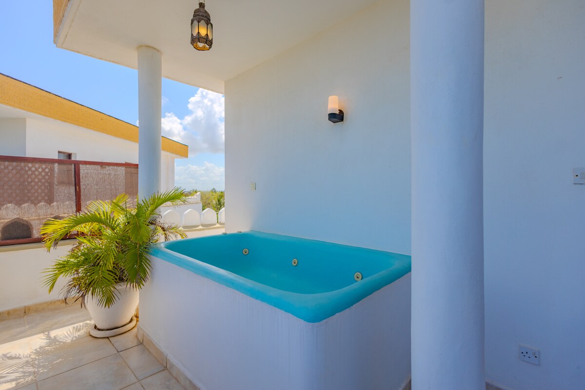 Penthouse 1 is a luxury 1-King bedroom apartment with spectacular views to the east of the turquoise blue Indian Ocean and to the west of Shimba Hills, a Kenya National Reserve. Just a short 5-minute stroll through the lovely gardens of the lovely Galu Beach gated community brings you to the world famous white sands of Diani Galu beach. Enjoy walks on the beach and a swim. A 10-minute tuktuk ride available right outside the gate will take to you to our shopping areas as well as further dining.