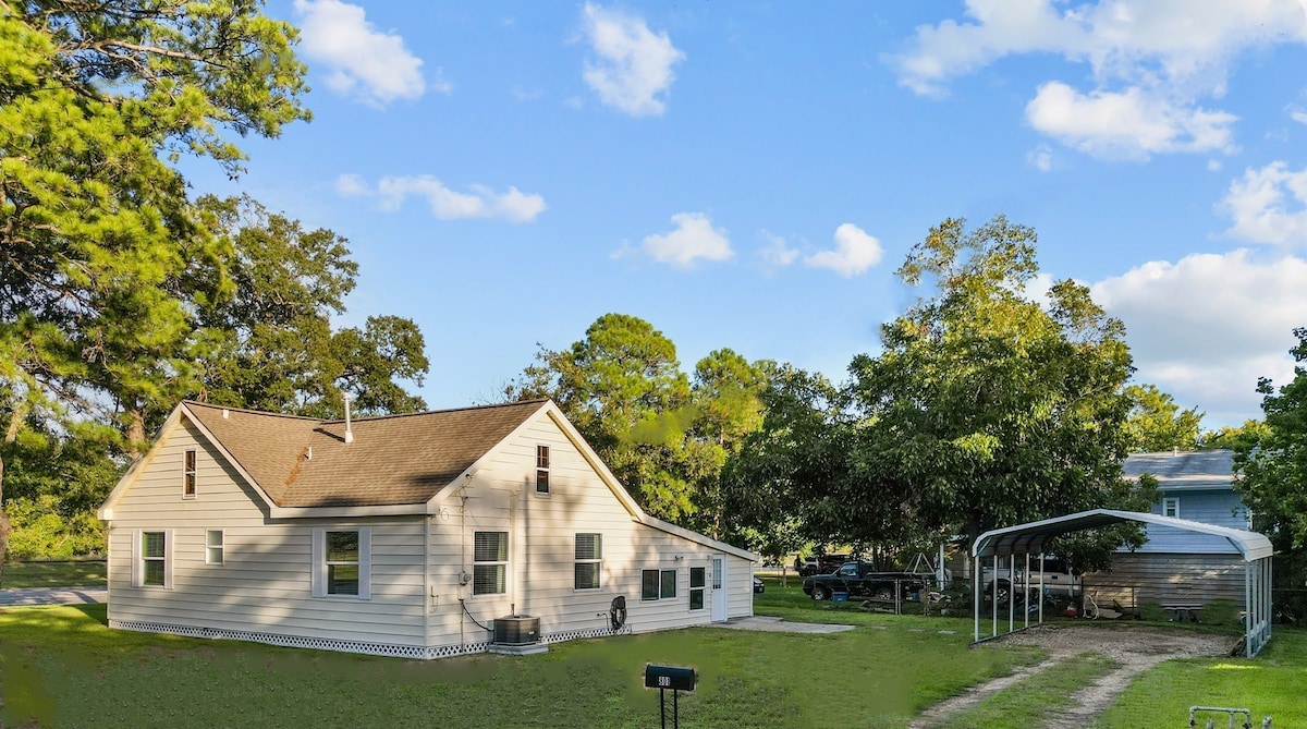 Enjoy a relaxing stay at the beautiful villa. It has a breathtaking view of the bayou. It is only 2 minutes away from I-45 highway, which is an easy commute to Nasa, Galveston, or Houston. As well as an outlet mall 5 minutes away. The house is equiped with a ton of amenties like fast wifi, a huge tv, a large backyard, a fire pit, a private dock, and even a kayak is provided. This unique place has a style all of its own.