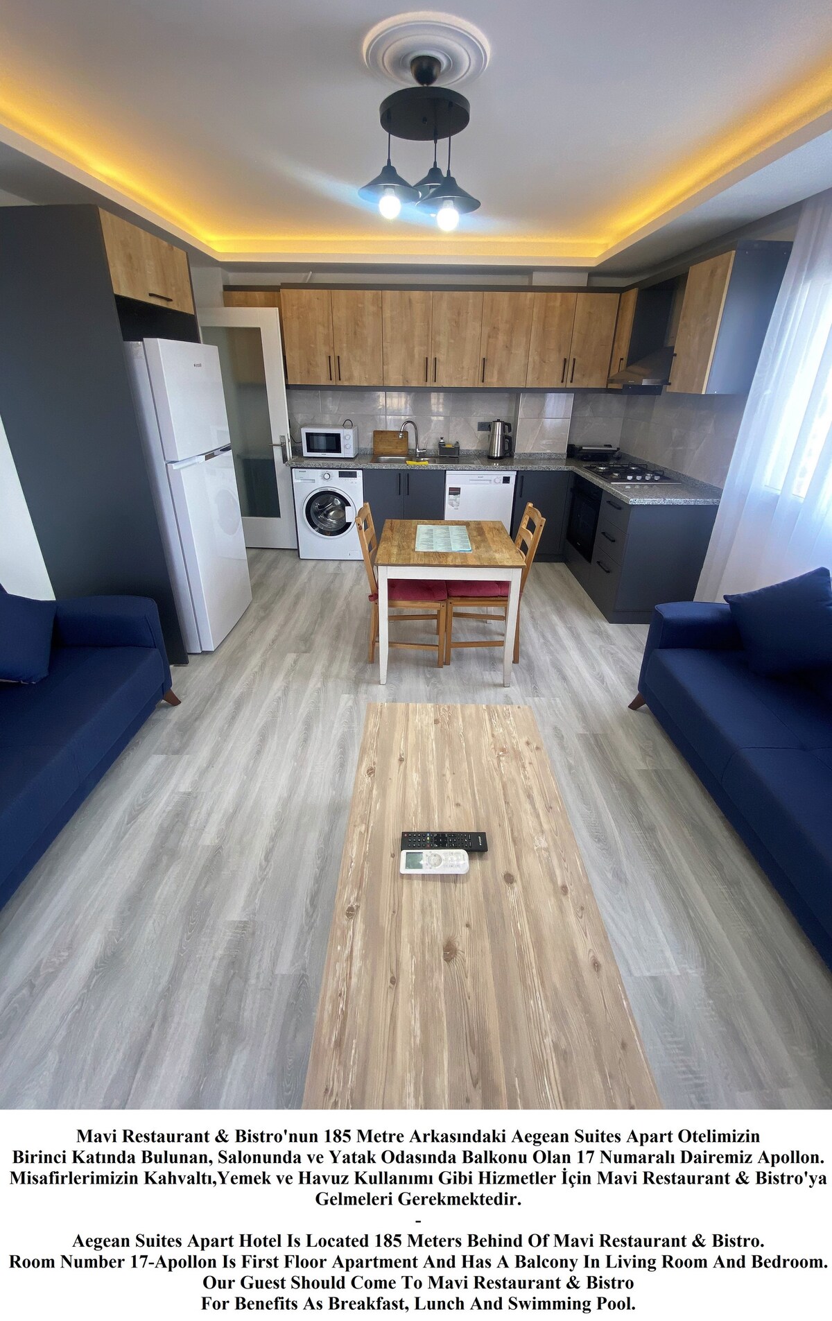 Mavi Restaurant & Bistro'nun 185 Metre Arkasındaki Aegean Suites Apart Otelimizin Birinci Katında Bulunan, Salonunda ve Yatak Odasında Balkonu Olan 17 Numaralı Dairemiz Apollon. Aegean Suites Apart Hotel Is Located 185 Meters Behind Of Mavi Restaurant & Bistro. Room Number 17-Apollon Is First Floor Apartment And Has A Balcony In Living Room And Bedroom.