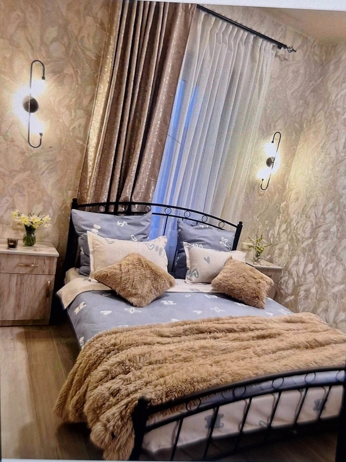 A cozy studio apartment, with all amenities - comfortable queen size bed, well equipped kitchen, folding sofa. Best for 2 adults and 2 kids, or 3 adults. Has a central heating and cooling. French balcony. There is a pool and a saunas in the first floor of the building.