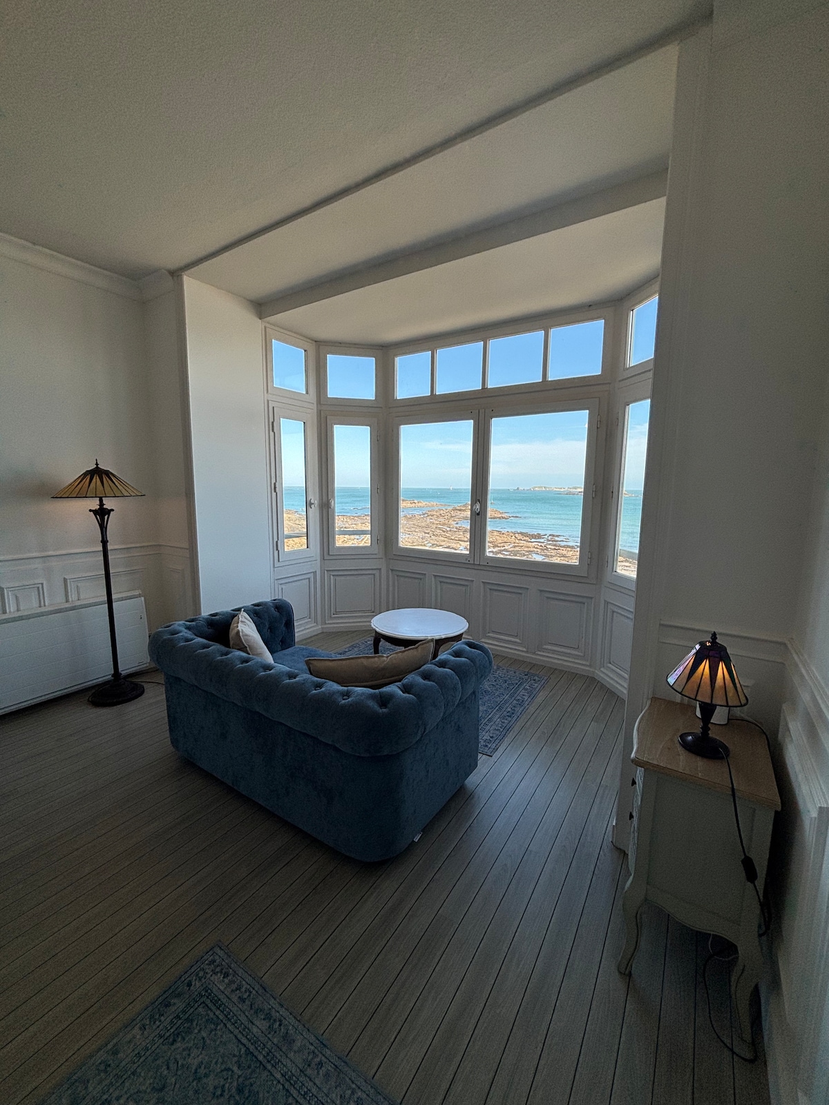 Stylish duplex apartment located on the second floor of XIX century villa named Ker Eole with amazing 180 degree breathtaking see view balcony on all dinard- saint-Malo bay , situated 10 meters from the beach, relaxing stay in the pleasant and peaceful area 5 minutes away by walk from the center with access to the several quality restaurants and shops. The apartment is fully refurbished with high quality furniture, original parquet, marble fireplace in large living room with fantastic sea view.