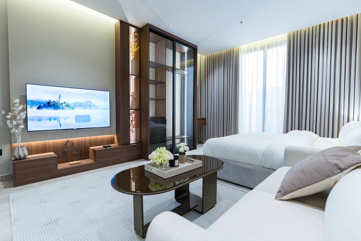 A modern studio with self-check-in and a separate entrance, in the Hittin neighborhood near the Boulevard and all the events behind Sad Square, it features a modern design with comfortable and calm colors and upscale furniture in addition to a 65-inch smart screen with all applications (Netflix, Shahid, OSN) There is high-speed Internet in addition to a special coffee corner with its accessories, a refrigerator, an electric kettle, and a microwave. There is also shampoo, conditioner, towels, and slippers in the bathroom. The studio is characterized by calm, relaxation, and privacy for those who want calm and comfort
