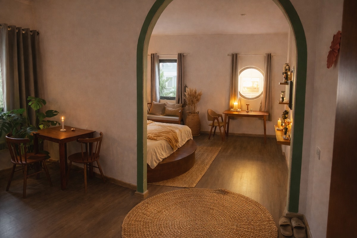 Kanso @ Cozinema offers three unbeatable features: 1. Prime Location: Heart of HCMC, 1 min to Bui Vien Street and 5 mins to Ben Thanh Market. Surrounded by cafés, local eats, and public transports right at your doorstep. 2. Skyline & Parkfront Views: Enjoy a breezy balcony overlooking 23/9 Park, blending lush greenery with stunning city skyline lights at night - the perfect balance of calm and vibrant. 3. Cinematic Retreat: 100" 4K projector & Dolby 5.1 audio for ultimate relaxation.