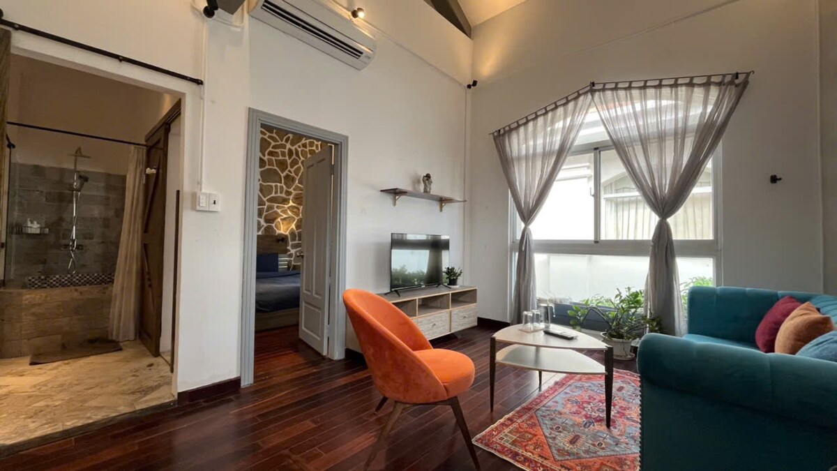 Căn hộ được trang bị sofa lớn êm ái, khu vực bếp mini với các thiết bị cơ bản tiện lợi. Không gian ngập tràn ánh sáng tự nhiên nhờ hệ cửa sổ lớn. Căn hộ có phòng ngủ và nhà vệ sinh riêng biệt, đảm bảo sự riêng tư và thoải mái cho khách lưu trú.