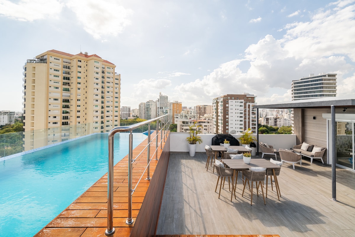 Luxury Santo Domingo Apartment in the Heart of It All 🌇 Welcome to your chic escape in the heart of the city—just steps from premier malls like Agora and Blue Mall, and upscale restaurants including Laurel, Pepperoni, and La Viuda. This adults-only, smoke-free apartment offers elegant interiors, a rooftop pool with panoramic views, a modern gym, and serene common areas. Whether you're here for leisure or business, enjoy the perfect blend of luxury, comfort, and convenience.