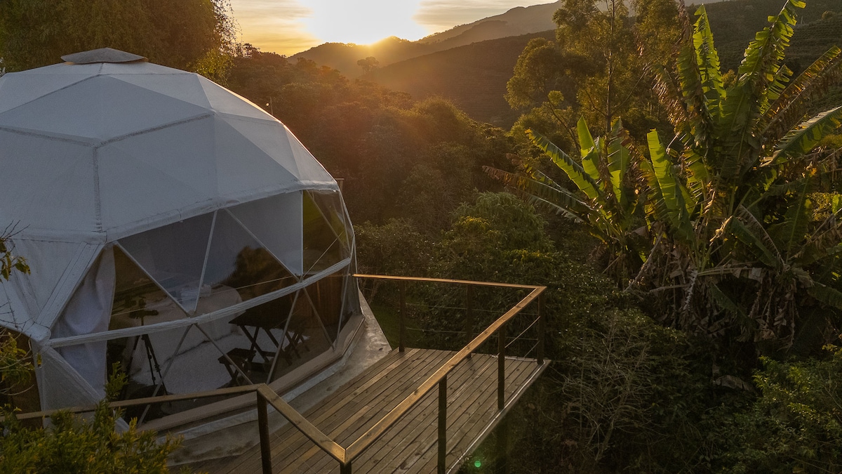 Glamping Caparaó offers an unforgettable lodging experience. Located in the middle of a coffee farm, 4 km from the Capixaba Entrance to the Caparaó National Park, it is ideal for nature lovers, hiking and waterfalls. The Terracota dome is 38m², has a 50-inch 4K TV, an equipped mini-kitchen, hot and cold air conditioning, a whirlpool tub, a dining counter and table that can be used for home-office work, as well as a deck with a spectacular view of the mountain and our river.