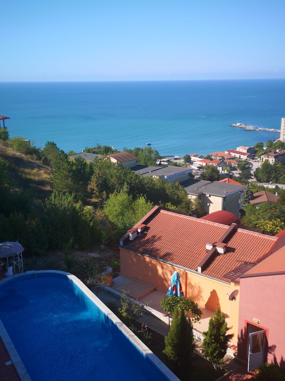 Enjoy a vacation at our villa in the Fish-Fish area near Balchik, just a 10-minute walk from the beach. The villa offers 5 bedrooms for 13 people, 4 bathrooms, two terraces with sea views, a heated pool with sun loungers and a gazebo with barbecue. The kitchen is fully equipped and all rooms are air-conditioned. We have a closed parking lot for 2 cars and additional parking spaces. Pets are welcome. Perfect place to relax and have fun by the sea!