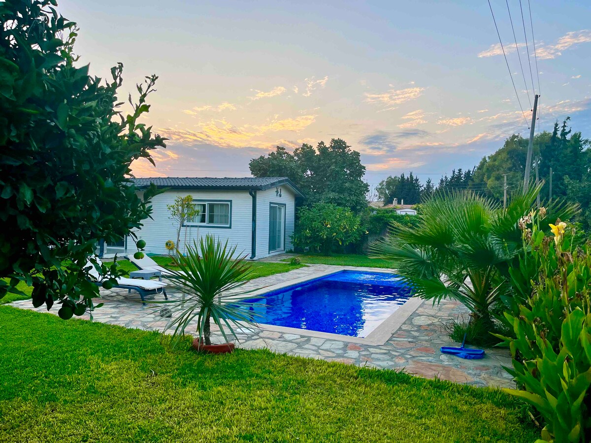 Unique bungalow in an calm soothing ORGANIC orange and lemon garden. Relax your body in an open-air heated jacuzzi. In the afternoon, walks in the fresh air by the sea in Akyaka 10 min by car from the house, a walk in the pine forest just behind, horseback riding in the stable. In the evening you can watch your favorite Netflix series. Grossery and alcohol shop 10 min by walk.