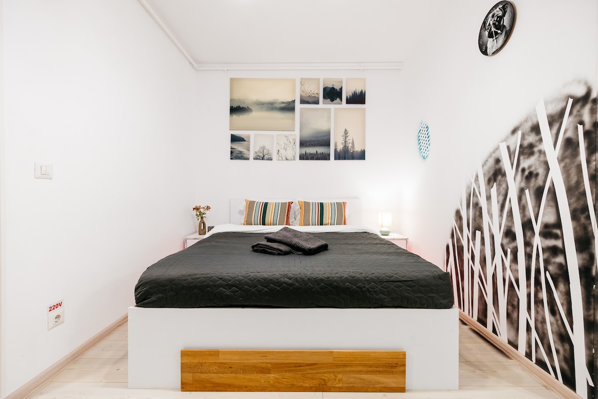 Relaxează-te în acest spațiu calm și elegant, apartament intim și cochet cu o suprafață de 32mp dotat cu pat matrimonial 160x200cm, SmartTV UHD diagonala 43 inch(108 cm), YouTube, Netflix și alte aplicații preinstalate, aer condiționat, mașină de spălat, fier de călcat, bucătărie utilată.