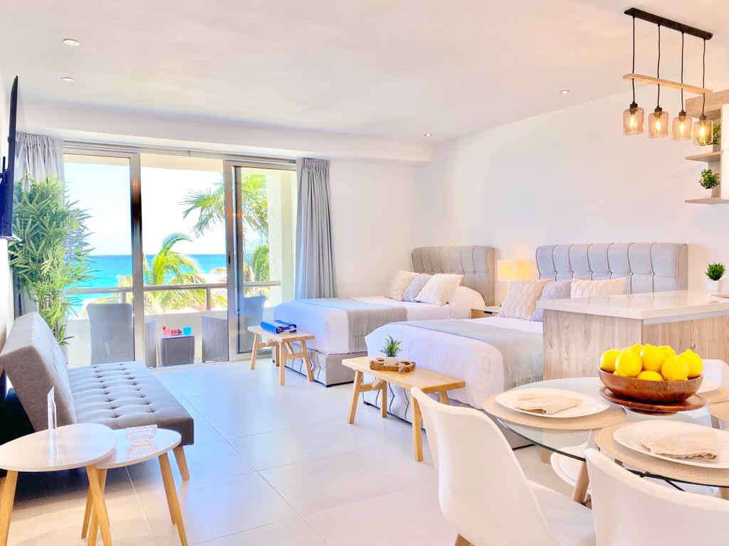 Stylish studio with amazing views, located in a 3 tower condo-hotel, pristine private beach, turquoise water, white sands. Huge wrap around balcony ocean and lagoon view. High speed Wifi, A/c, Smart Tv , safe. Lounge chairs and tents for free at pool and beach. Gym, tennis court, Coffee shop at lobby. Spa (with extra fee) Flexible All Inclusive Option for food and drinks -Pay only for the day(s) you want it-. Decide as your vacation unfolds.(today $95 usd p/p per day) ideal for couples