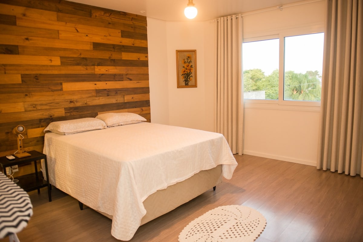 A double bed and an extra single mattress. Central apartment. Two blocks from the university, on the same block there are 2 supermarkets, 3 pharmacies, a pizzeria, hamburger joint, pastry shop, lottery, petshop, laundry and stationery. Private garage doubling the free block for guests. Practicality and convenience.