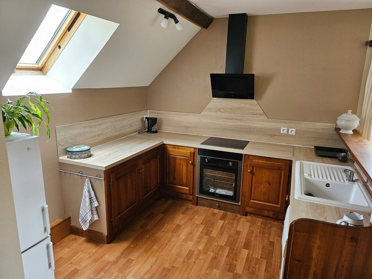 Independent and elegant 48 m² studio in a detached house, accommodating 2 people. It is equipped with a kitchenette, bedroom, office area, sitting area with TV and separate bathroom and toilet (baby cot and armchair on request). A relaxation area to discover ;) Bath towels and bed linen are included in the price. The accommodation also has a courtyard for parking and a private garden (garden table, ping pong table).