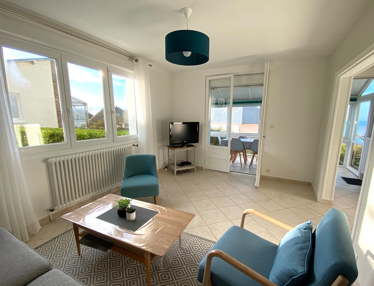 Designed for a person in a wheelchair, this accommodation benefits from a large, bright living space facing the sea, completely renovated in July 2024. On the garden side, the large bedroom is very quiet and overlooks a veranda where you can have lunch or relax peacefully. The ground floor is completed by a large shower room/toilet, an entrance with storage cupboards, a back kitchen and the garage giving access to the upper floor, never rented at the same time as the ground floor (second listing)