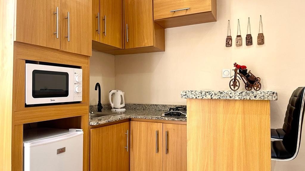 Chambre meublee luxueuse situee au coeur de la capital economique sur Rue Njo-Njo Bonapriso Douala en face de la station d'essence MRS a 2 juste mins de l'hotel la Falaise Bonapriso. Espace unique et memorable pour vos sejours dans un cadre tres propre et reposant. Climatissee - Chauffe-Eaux - Hyper-securisee - TV - Free WIFI- Free Parking nous offrons Pizzas - Boissons - Restaurant - Cuisine - Frigo - Microonde - Salle de sejour pour votre confort. La reception est ouverte 24/7