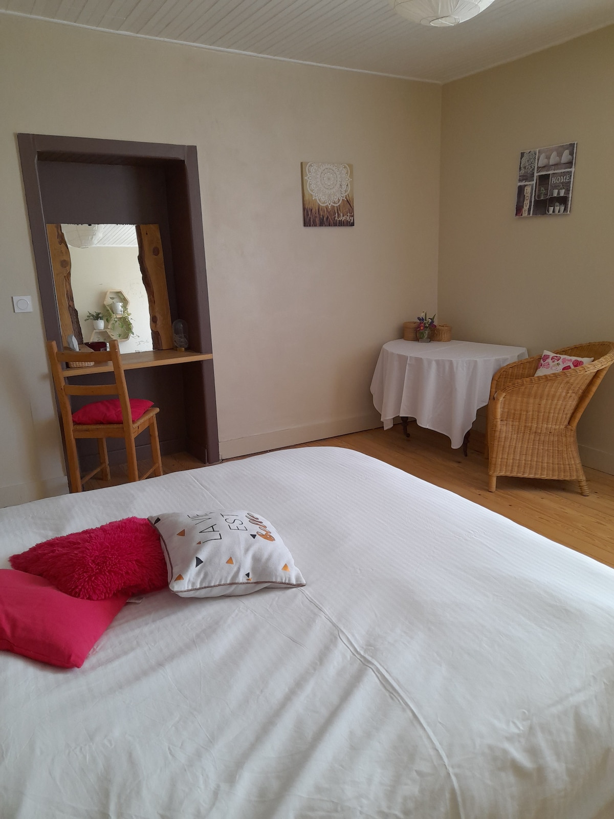 Very spacious and very bright room, in a house in the countryside, being renovated. The bathroom is private and the toilet is separate. Access is independent, from the entrance we share. Unfortunately, the presence of a few steps and a staircase does not allow us to accommodate guests with limited mobility. I've lived in the UK for several years and speak English fluently. Would love to have English speaking guests! :)