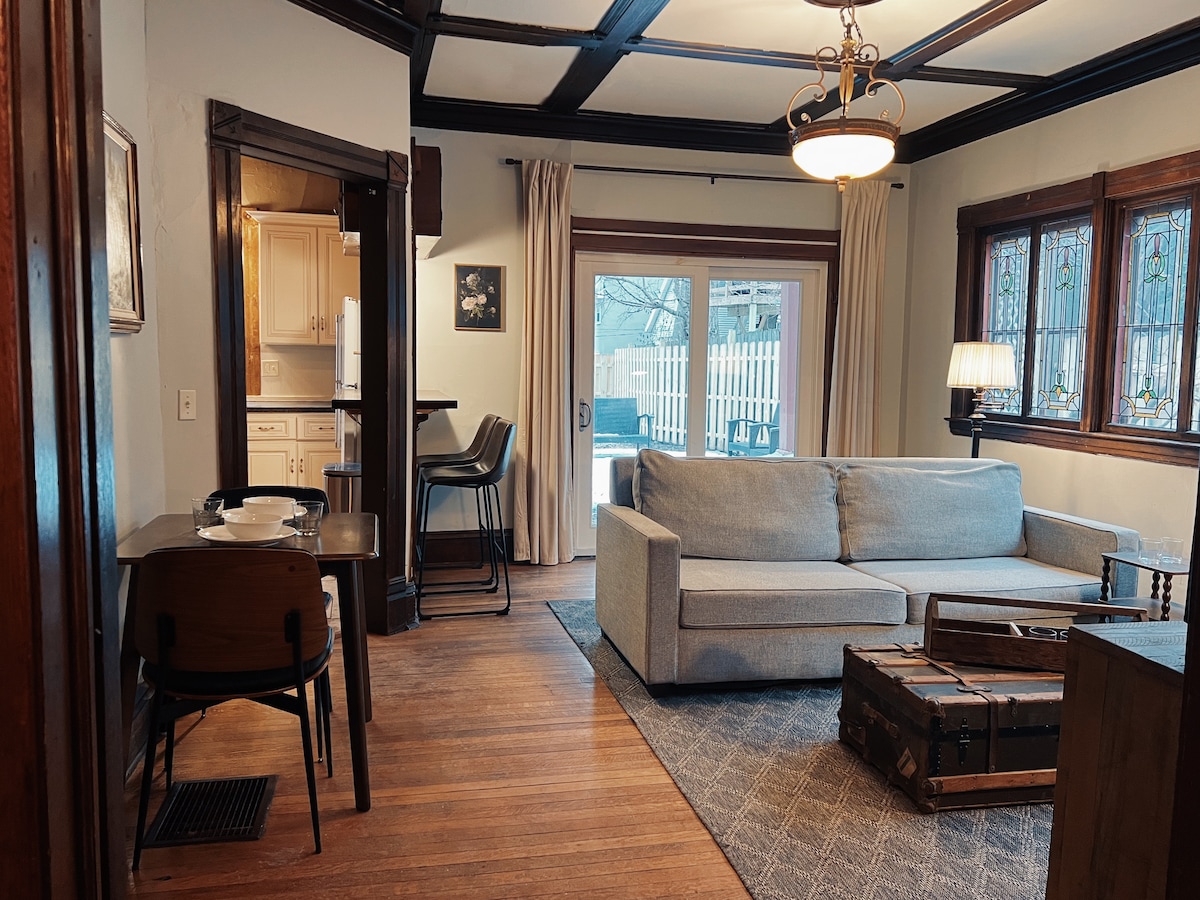Apartment 1 is the lower unit of a charming two-unit home, offering a cozy stay with historic character. Enjoy original hardwood floors, beautiful woodwork, & built-in cabinets in the dining room & kitchen. A large dining table is perfect for meals or work. Relax with radiant heat, blackout blinds, ample closet hanging space, & 680-thread-count sheets. Bedroom 1 features an original pocket door. Each unit has its own private entrance; please note the upper unit may be occupied during your stay.
