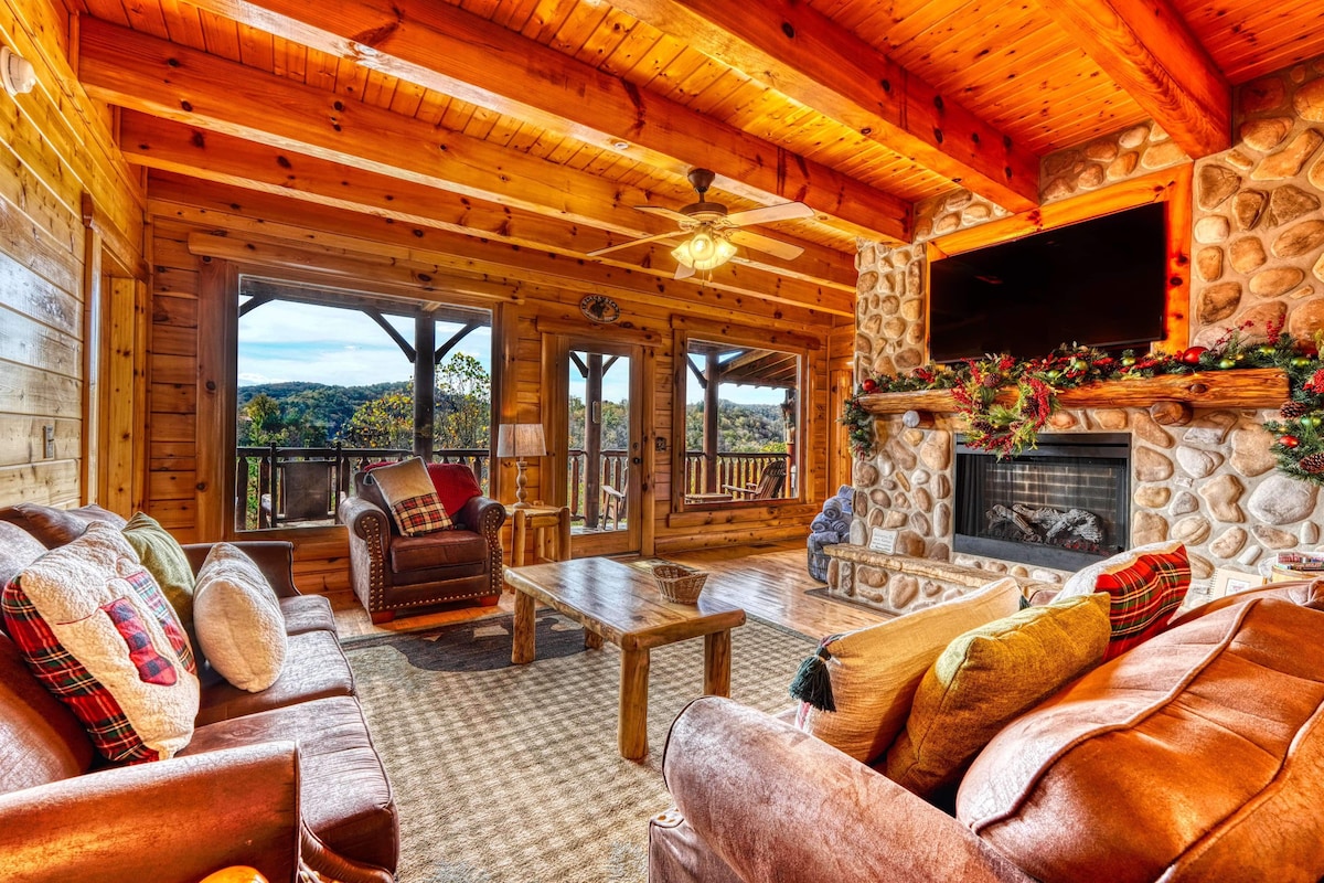 Stunning Mountain Top Cabin w/ Fall Views, Private Hot Tub, Community Pool, 6.5 mi PF PWY, 15 mi Gatlinburg, 16.5 mi to SMNP! Large parking area. Spacious resort community w/ full amenities, well paved roads, and easy drive! Features: 2-level decks, floor to ceiling windows, gas fire place, 5 smart TVs, Super Fast Wi-Fi, pool table, arcade, BBQ grill (BYO Charcoal), outdoor dining, swing, private hot-tub, stocked kitchen, washer/dryer, everything needed for an unforgettable family vacation!
