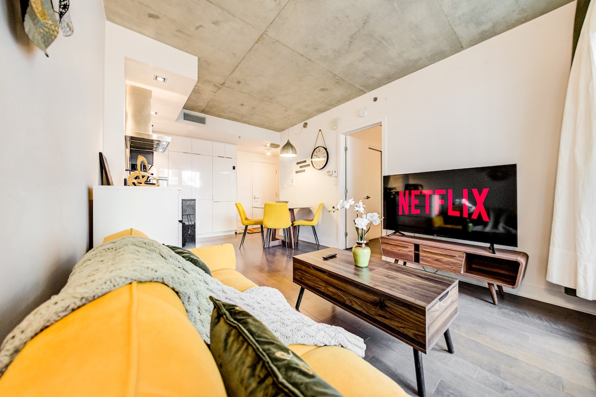 Enjoy your stay in the heart of the city ! Brand new TDC 2 downtown luxury with direct Bell Center access! Revel in comfort in our fully furnished and equipped one-bedroom condo with own private balcony! Your stay includes access to a sauna, pool, gym, skylounge, gaming room, lounge, and terrace with multiple barbecues. Free underground parking, with the subway just minutes away. Without stepping outside, the city is yours to explore. Plus, unwind with complimentary Netflix for the perfect stay