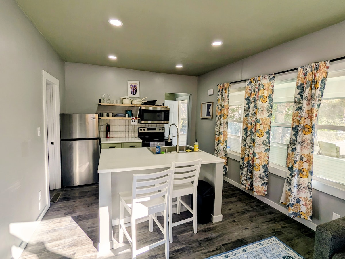 Our Little Boho studio on the top floor of a quiet 4-plex is the ultimate in modern comfort! Every detail is designed with luxury in mind, including a custom kitchen and bath, velvet drapery, and fine finishes. Relax in style with a plush king bed, full-size sleeper sofa, well-equipped kitchen, W/D, patio, and private parking. We are nestled in Little Bohemia, close to downtown, CWS, & the zoo. Enhanced cleaning and self-check-in ensure you're in good hands. Book now for an unforgettable stay!