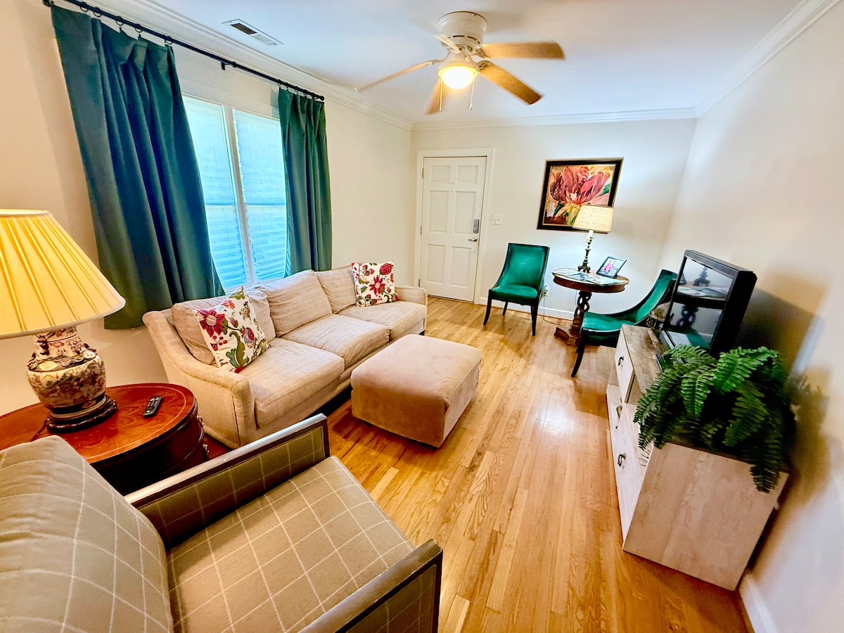 Situated in a quiet, tree lined courtyard. Two blocks to historic Village District (formerly Cameron Village) with over 90 stores and restaurants.Walk to YMCA & NCSU. This cozy condo features a comfortable KING sized bed,wireless internet, fully stocked kitchen, microwave, keurig coffee maker. Washer/dryer in unit.Fresh linens, laundry supplies and all paper products are provided. The living room has a TV with Roku and Netflix. Reserved parking space. Raleigh STR License #ZSTR-000012-2021