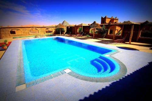 this old kasbah views a large , natural sand dunes of Erg Chebbi Morocco. A place to those who seeks tranquility and silence while watching a beautifull sunset and sunrise . It offers an outdoor swimming pool, rooms with patios overlooking the Sahara and free Wi-Fi.The guest rooms at auberge Erg Chebbi are in a Saharan style. Each has its own bathroom and shower .Guests can take their breakfast in their rooms or on the terrace which has panoramic views of the surrounding landscape.