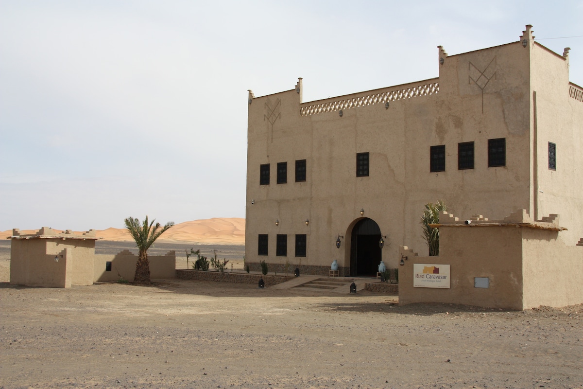 Riad Caravasar is located in a peacefull part of the village Hassilabiad in Merzouga dunes area, we have totally 10 rooms where our guests can spend the night in a warm and very freindly atmosphere, you can enjoy the view while you are drinking a cup of tea with mint, our staff is willing to help you in every moment, our reception desk is 24 hours. Everyroom has own beautifull and additionally build bathroom with warm water. and air conditioning. in the whole Riad there is wifi. Welcome
