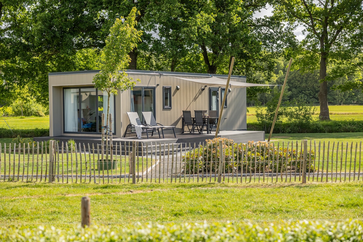 This luxury chalet has a high lectern roof, which is a private design that creates a spatial experience of this vacation home. Outside is a spacious canopy with LED lighting for a cozy evening on the spacious lounge set or at the large dining table. Privately shielded with a beech hedge. There is a private parking space next to the house. In the shed, there is a washing machine and a drying rack, 2 sunbeds. The whole is located on a campsite with a cafeteria, a small swimming pool, and playground.