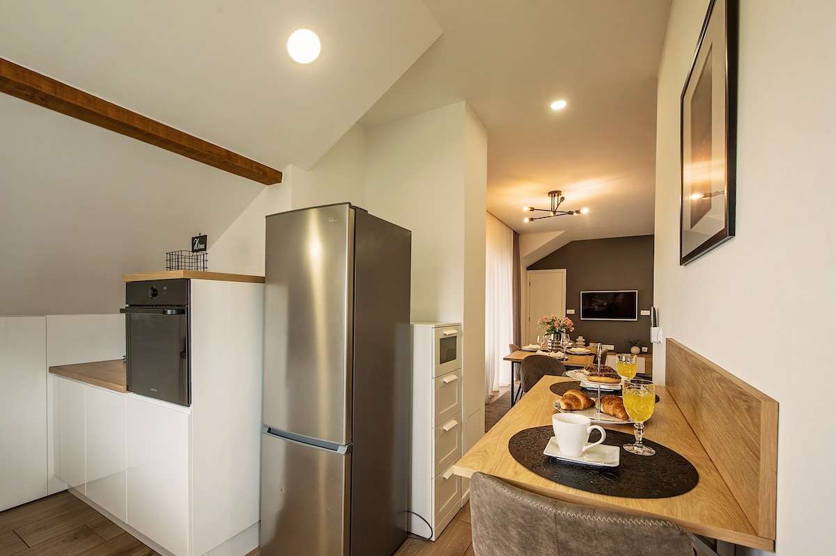This modern accommodation is the perfect choice for those traveling in groups. Only 50 m from the apartment is the "Apfel Arena" with sports, cultural and health facilities. The apartment is luxuriously furnished whit jacuzzi for 5 and finland sauna .On the terrace there is a private pool, deckchairs for resting and a gas grill for a perfect dinner, with a view of the Biokovo mountain