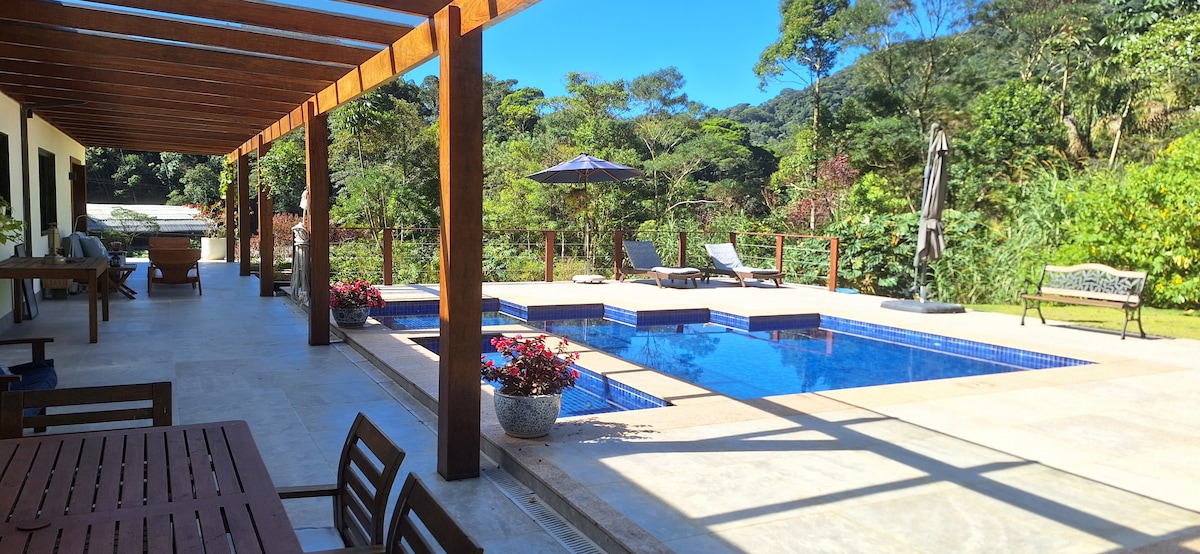 Spacious and cozy house in the middle of the Atlantic Forest, with a stream, mountain views and super quiet. Perfect for family moments and reconnection. 10 minutes from downtown Itaipava and easy access. The space The house has an indoor and outdoor fireplace, the suite has a queen-size bed, 50-inch TV, hot and cold air-conditioning. The hammocks, pergola, barbecue and shower make the leisure space super pleasant.