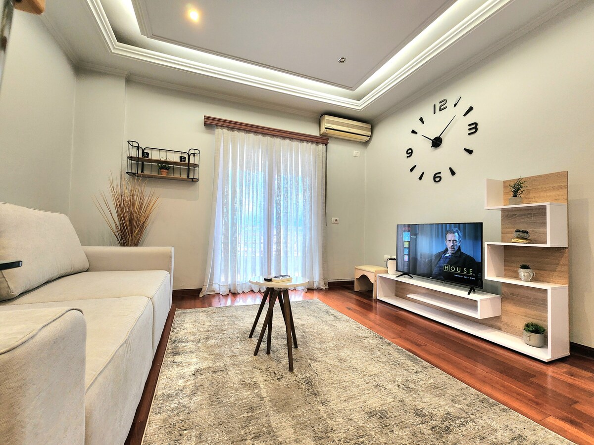 68 M2 apartment. 2 High-Quality A.C, Bedroom&Living Room. Fiber Optic Business WIFI 75 MBPS/10 Smart tv youtube&Netflix Double glazed windows soundproofing and thermal insulated windows Big Balcony (Smoking Friendly) Bedroom with A.C and queen bed Washing Machine. One sofa bed in the living room. 1 Queen bed, One sofa bed We provide professional cleaning our highest priority Supermarkets, Restaurants, Barbier, Bakery and Gym 2 minutes on foot. Coffee,Tea,Oil, Sugar&Spices.