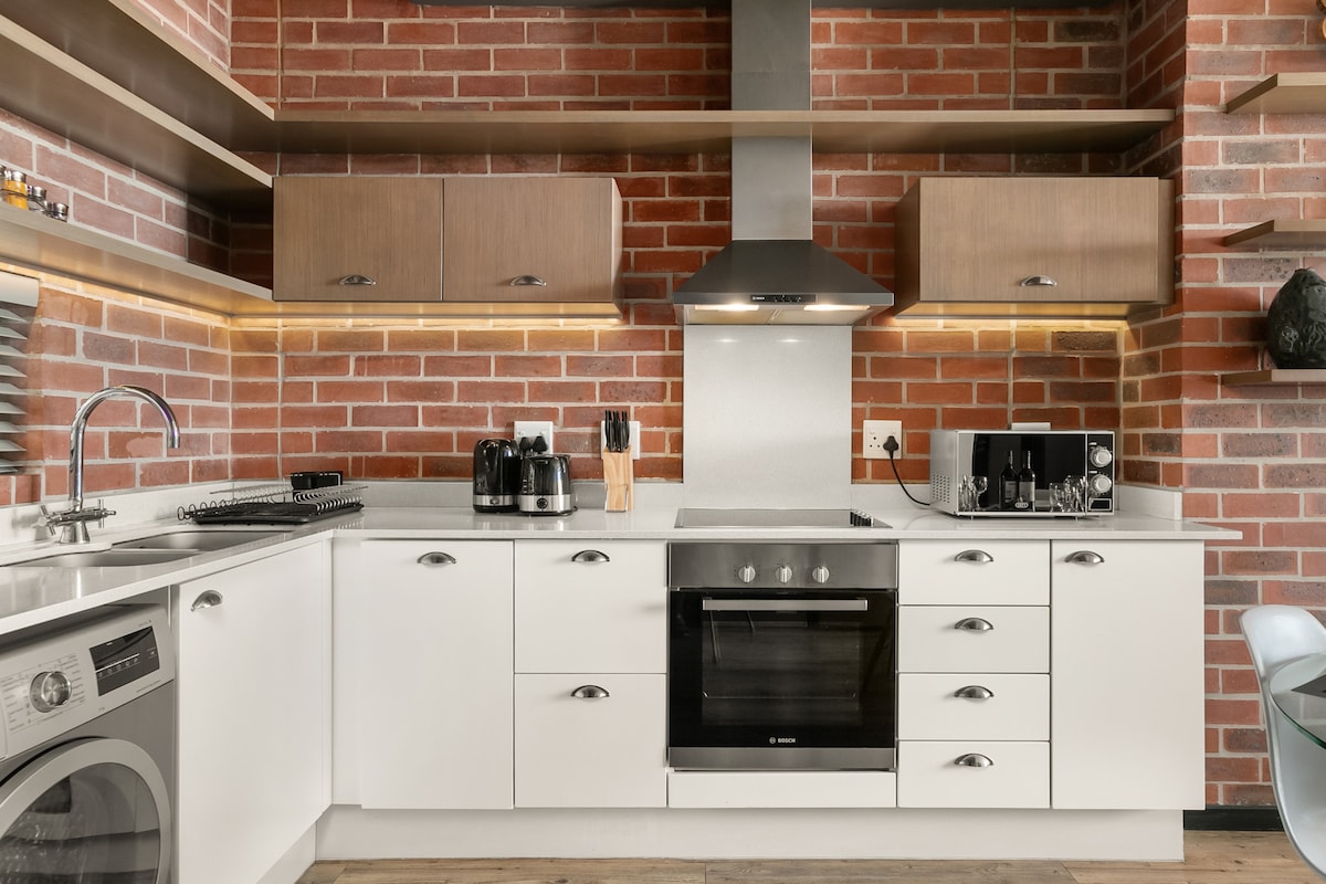Let the eyes feast on clever exposed-brick feature walls, local artworks, and a white subway-tiled bathroom. This Retro-Vintage New Yorker apartment, located at The Bedford Manor Centurion has a distinctive and charming aesthetic that blends past styles with modern amenities. The sparkling farmhouse kitchen has stainless steel appliances, while sockets fitting local and international plugs are a nice touch. This flat is fully wheelchair accessible and is located on the ground floor.