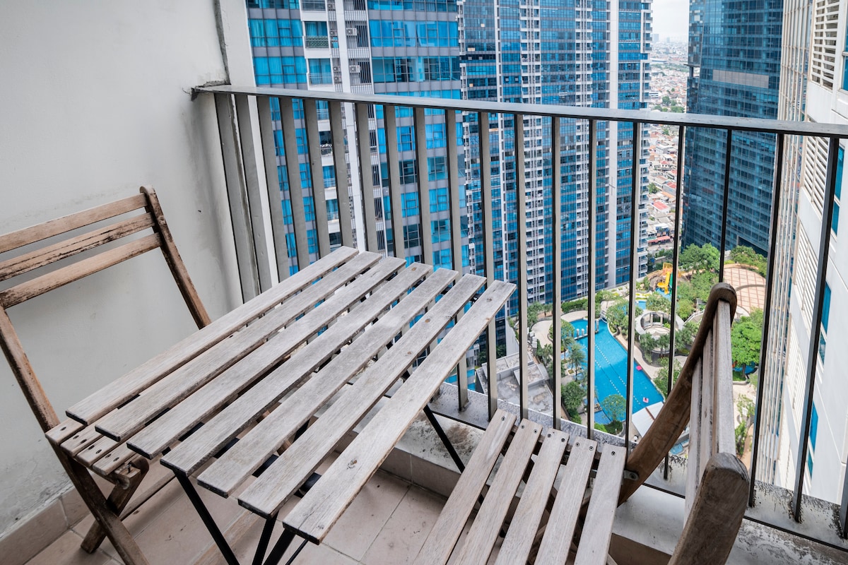 Kick back and relax in this calm, stylish space in South Jakarta, right next to 7 hectares ecopark. Industrial design, luxurious studio full-furnished apartment : fully equipped kitchen (stove, refrigerator, Nespresso machine, all cooking and dining equipment), 43-inch android tv, sofa, queen bed, bathroom with hot shower. Building facilities include swimming pool, jacuzzi, gym, and parking space. At 22nd floor, you have a splendid view of Jakarta city.