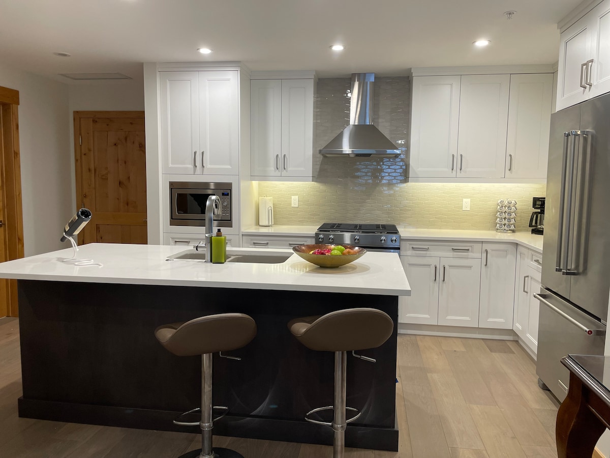 Welcome to your luxurious mountain retreat! This brand-new one-bedroom king suite accommodates up to 4 guests. Just a 10-minute walk from the town center, the suite features a king-sized bed, a pull-out king sofa bed, one bathroom, a fully equipped modern kitchen, flat-screen TVs, a washer/dryer, and luxurious linens and towels. The suite includes access to a hot tub, gym, and one underground parking space. Short-term rental license: RES-09778
