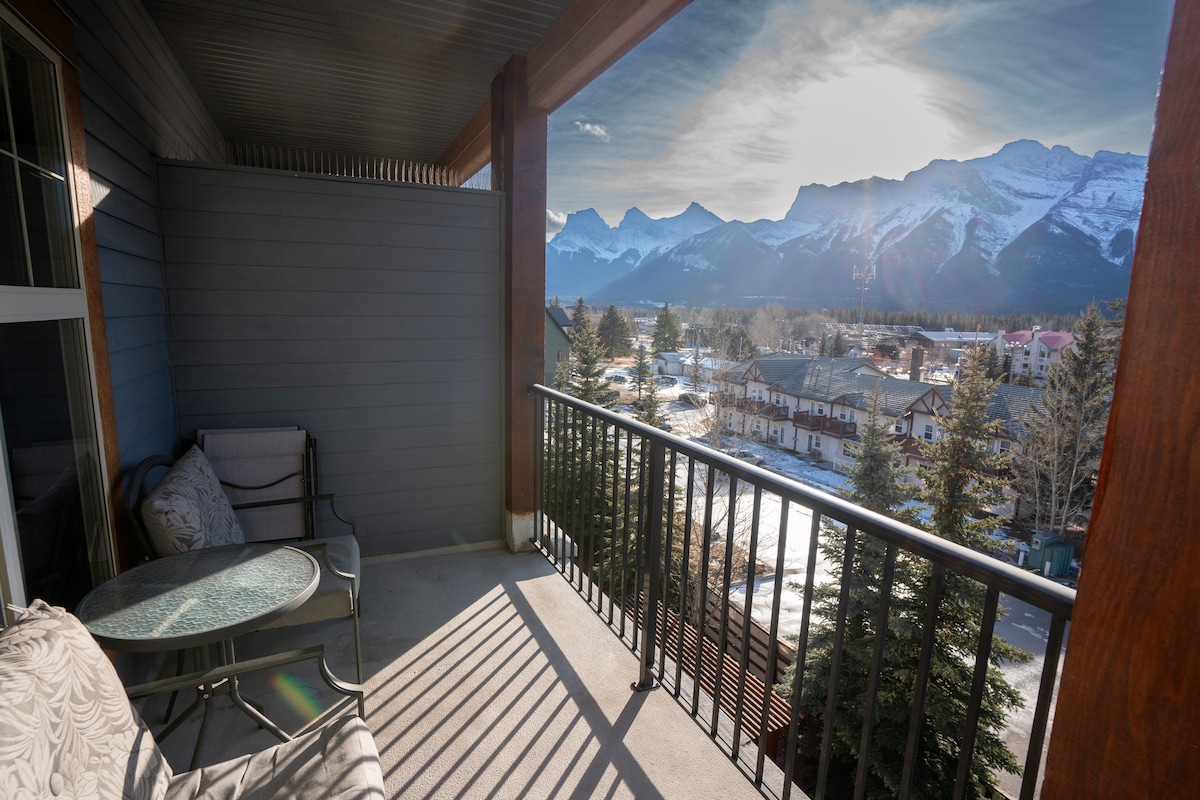 Top floor 1 bedroom suite offering stunning views of Lady Mac & Grotto Mountain from a private balcony: - 15 min walk to downtown Canmore - 15 min drive to Banff - Free High-speed Wi-Fi & Cable - Free Banff Park Pass - Heated Underground parking with EV chargers - Master bedroom with King Bed, walkout to balcony - Living Room with fireplace, TV & a plush couch that can easily be pulled out into a queen bed - Full access to Resort shared amenities like heated pool, 2 hot tubs & BBQ/Patio area