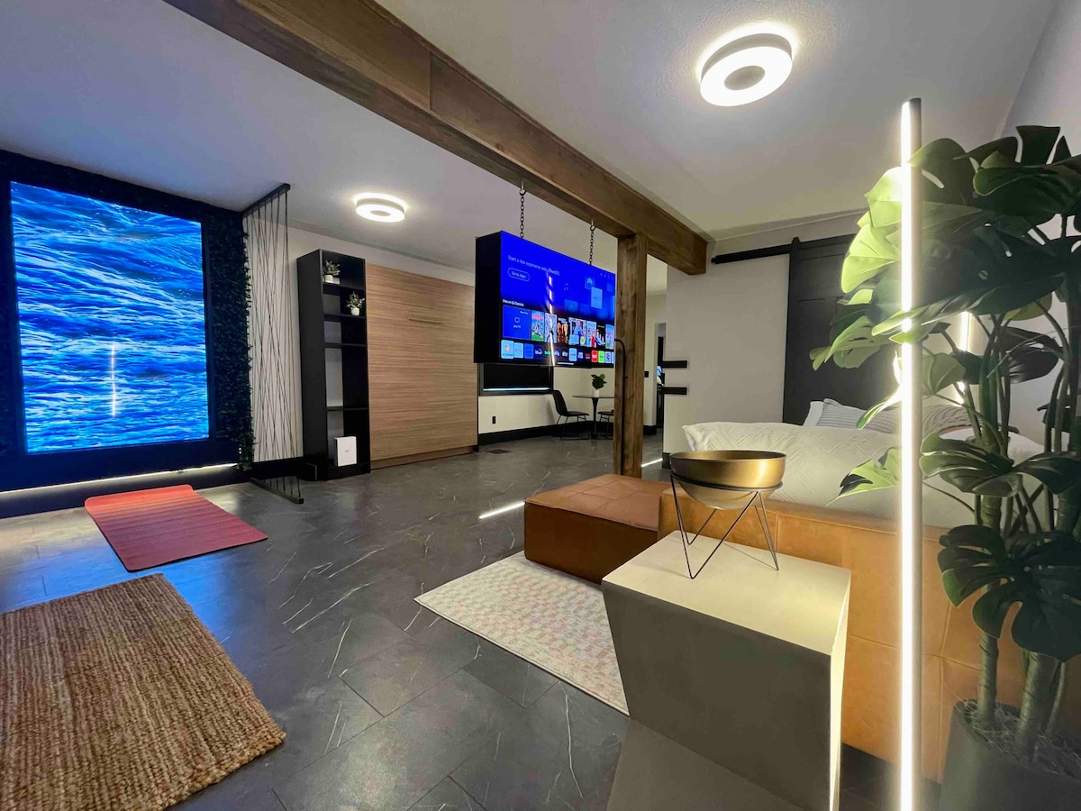 For our third experience, we truly wanted to create a boutique penthouse experience in a home. Instead of spending $500 for a hotel room, we wanted to curate a space that stands alone for less. Rest up or come alive by relaxing in the spa like washroom injected with a sauna and rain shower Relax or energize by setting the lights to unlimited auras with the touch of a button Meditate or workout in front of 4K nature videos on a vertical 85” TV Enjoy a bonfire Welcome to LNSNG LXRY III