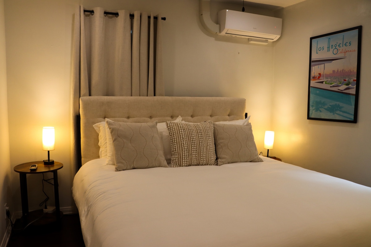 Enjoy this private, newly renovated, and light filled home. Located in a safe and quiet neighborhood, this spacious home is perfect for a large group. There are 2 bright and comfortable bedrooms, One king size and one queen mattress. There is a twin size daybed in the living room and two rollout twin beds. 🚙 35 min to LAX * Private entry with keycode * Private Washing / Drying Machine Access * Full kitchen amenities * Fast WiFi * AC in every bedroom ❄️ * Bidet * Level 1 EV charger