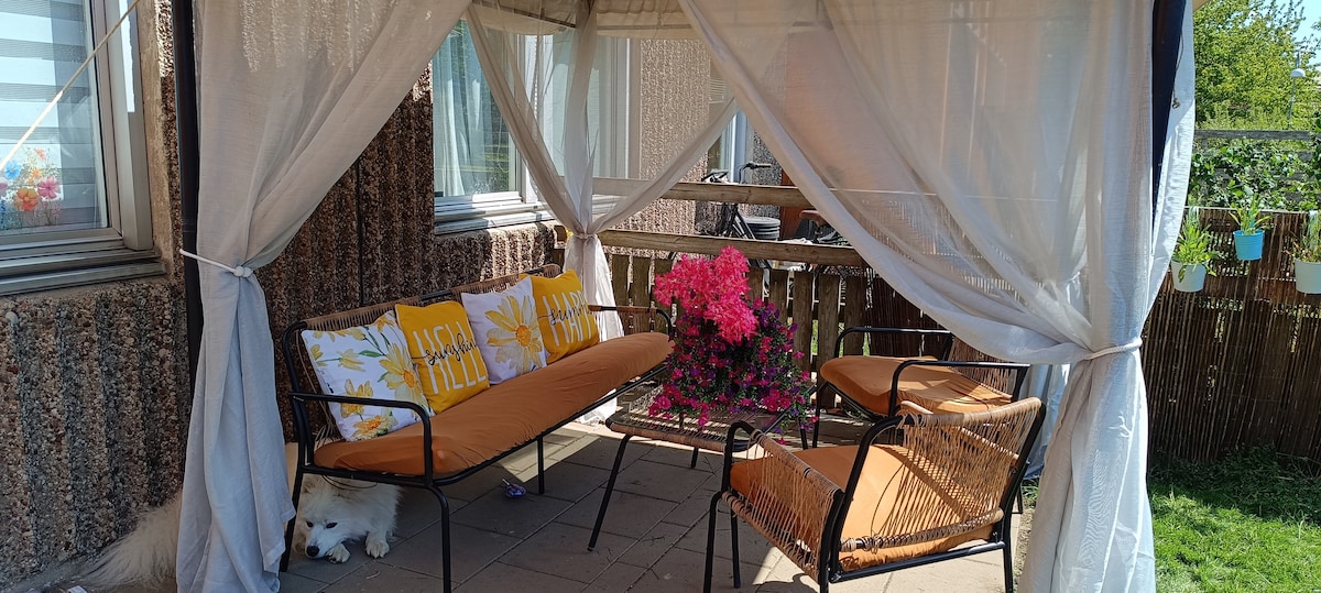 3 rooms and kitchen on the ground floor in a quiet area. Suitable for a family with children or a party of up to 5 people who want to stay in a quiet area without having their night sleep disturbed. Perfect as a base for those of you who want to discover Gotland but still live in Visby, there are buses just outside that take you to the city centre and the inner city. There are both playgrounds and green areas in the area. The apartment has a large secluded terrace facing a forest. Don't forget to bring your own sheets and towels.