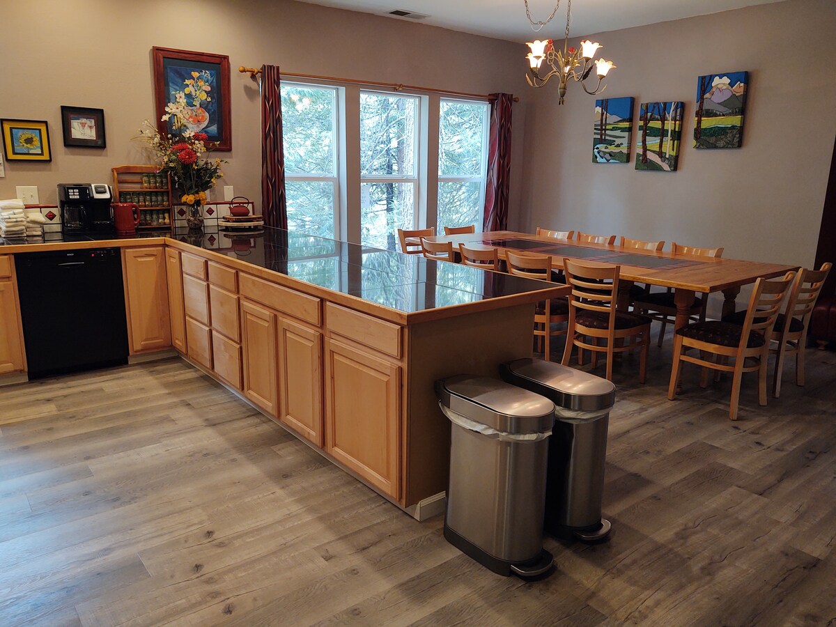 Deep in the majestic Sierras--but with easy access--a 4,000+ sq foot retreat with spacious kitchen, 5 bathrooms, 2 Jacuzzi baths, 5 huge bedrooms, man cave, den, deck, wheelchair access. Air conditioning. Yosemite is 60 miles, Shaver Lake 4. Near Huntington, Thomas Edison, Florence lakes and China Peak Skiing, Pacific Crest Trail. Quiet area NOT suited to loud parties or drinking events. CO2 detectors & fire extinguishers. Parking for 6 cars. Hiking trail. Quiet. Signed agreement & ID required.