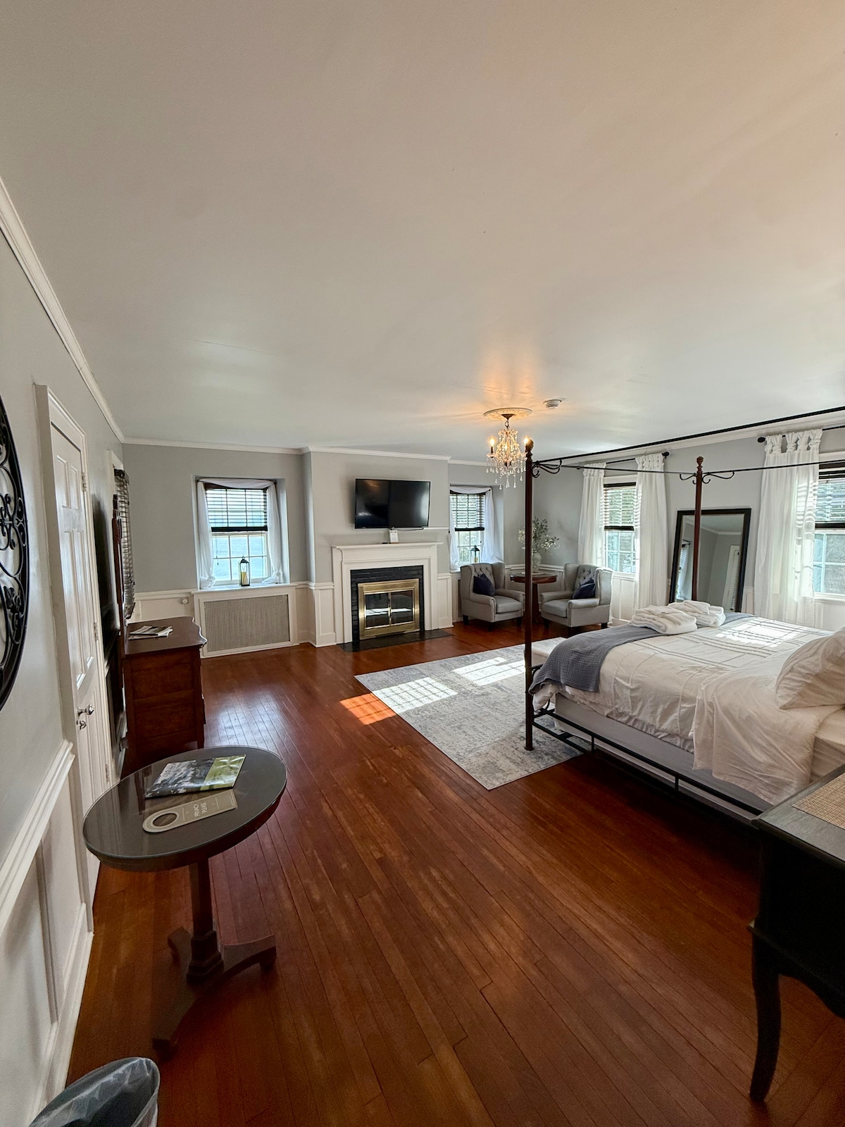 300 sq. ft. - 1 king bed Kitchenette: Furniture: table with 1 chair & 2-seat bench Cooking appliances: small toaster oven, induction cooktop, microwave with built-in hood Dishes - Kitchen utensils Dishwashing accessories Hypoallergenic duvet Hypoallergenic pillows Wood flooring Glass shower with rain showerhead Keurig coffee maker Microwave and mini-fridge LCD TV Work table and office chair