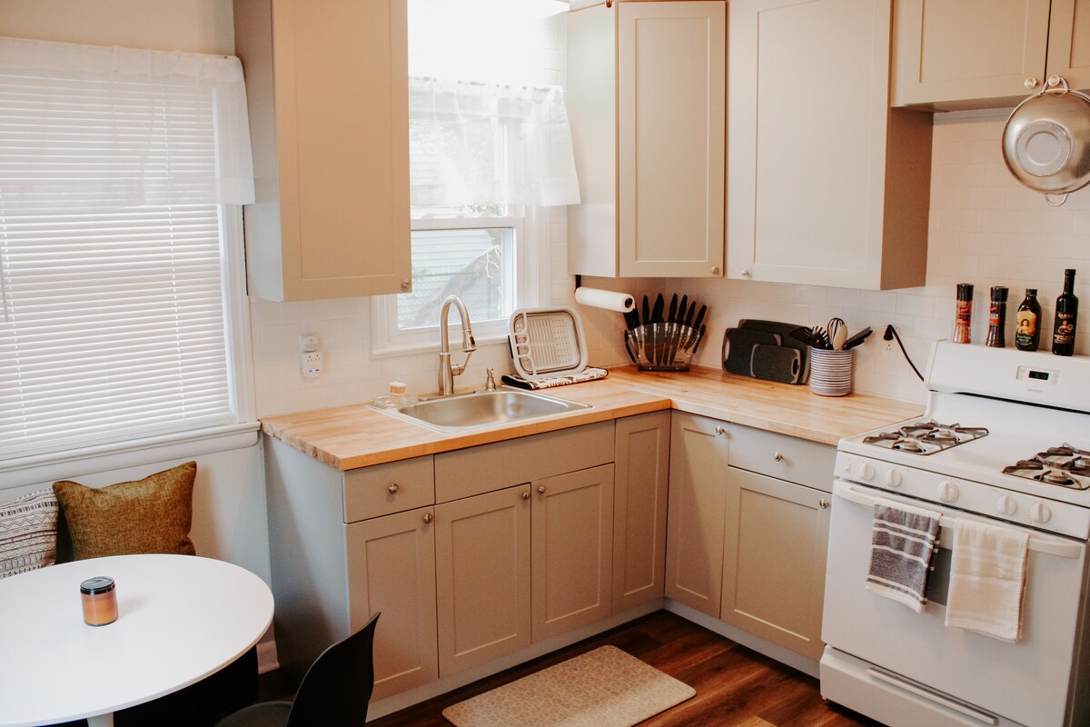 Welcome to the neighborhood! Located 2 minutes off I-90! High speed internet. Well behaved DOGS welcome! NO CATS Enjoy your stay in this relaxing space. You will delight in this unique/historical Cleveland neighborhood. Wake up feeling refreshed after dreaming through the night on the medium/firm queen mattresses. Comfort is important! In the kitchen, you will find all you need to prepare your favorite meals. Indulge in your morning coffee, or cuppa tea at the quaint breakfast nook.